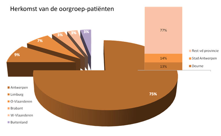 De patiënten van de oorgroep komen vanuit gans Vlaanderen en daarbuiten (zie onderaan voor grafiek). De patiënten zijn van alle leeftijden (zie onderaan voor grafiek). Door de bijzondere expertise in het onderzoeken van kinderen is bijna een kwart evenwel jonger dan 10 jaar. Er worden ongeveer 1000 dragers van een cochleair implant gevolgd en maandelijks komen er ettelijke nieuwe kandidaten bij.